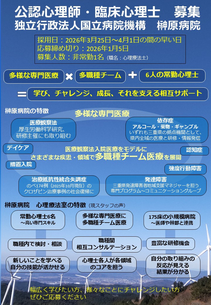 ~統合失調症、気分障害、アルコール依存症、薬物依存症、自閉スペクトラム症など、精神科病院ではさまざまな精神疾患・精神障害を抱える患者さんに出会います。特に榊原病院では依存症拠点機関でもあり、三重県発達障害者地域支援マネジャーもあり、幅広い精神疾患に出会います。どの職域でも出会う可能性があるからこそ、精神疾患を直接知る体験を積み、心理職としてさまざまな問題への感度を高めたいものです。